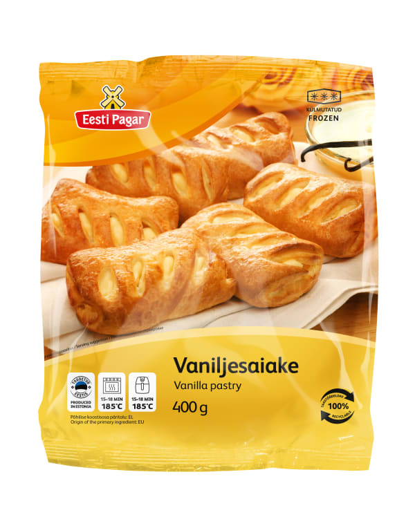 Retail packed Danish puff pastry with vanilla filling.