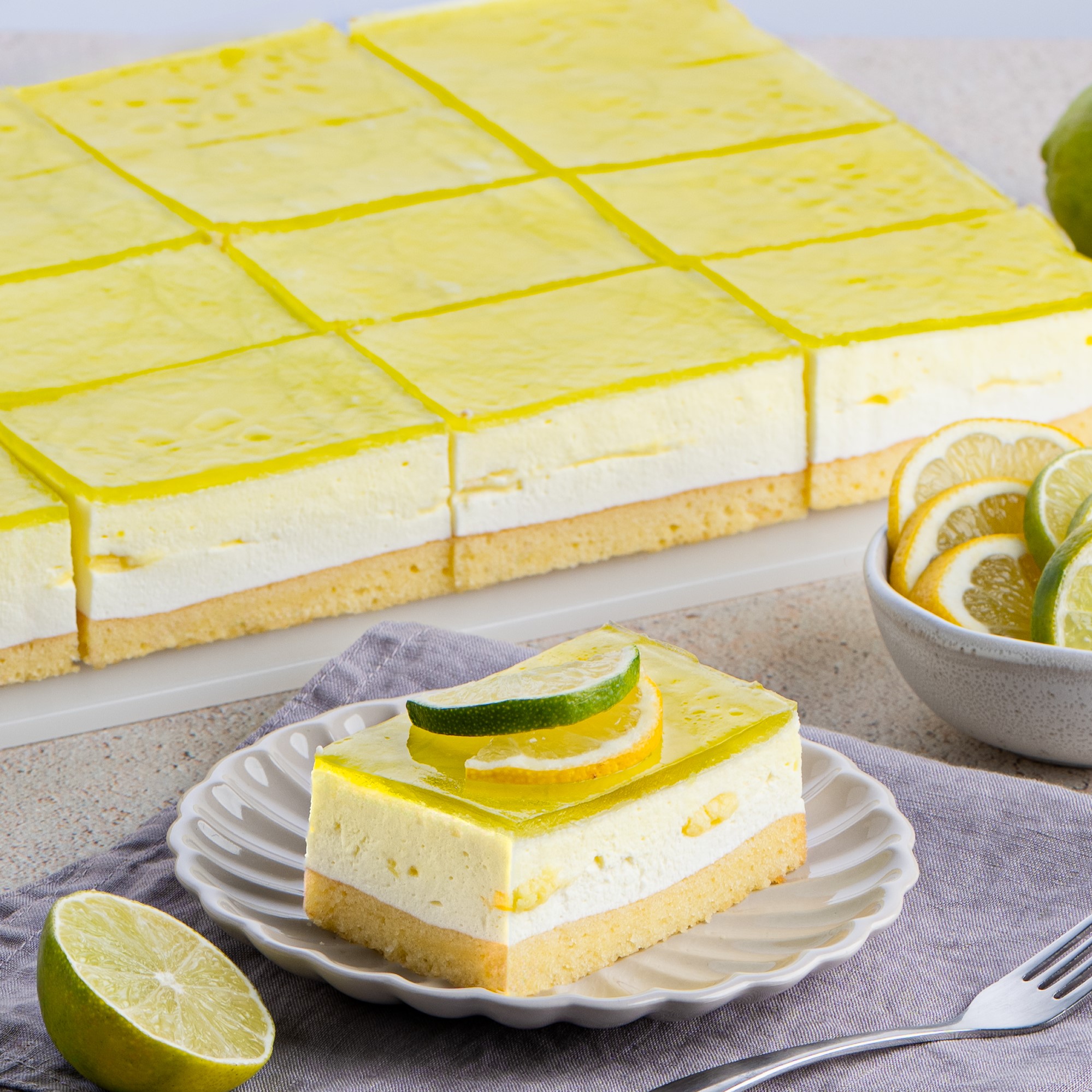 A soft cake base with sour cream and sweet and sour lemon cream. A lemon filling between the two layers. Garnished with lime jam and covered with delicate lime jelly.