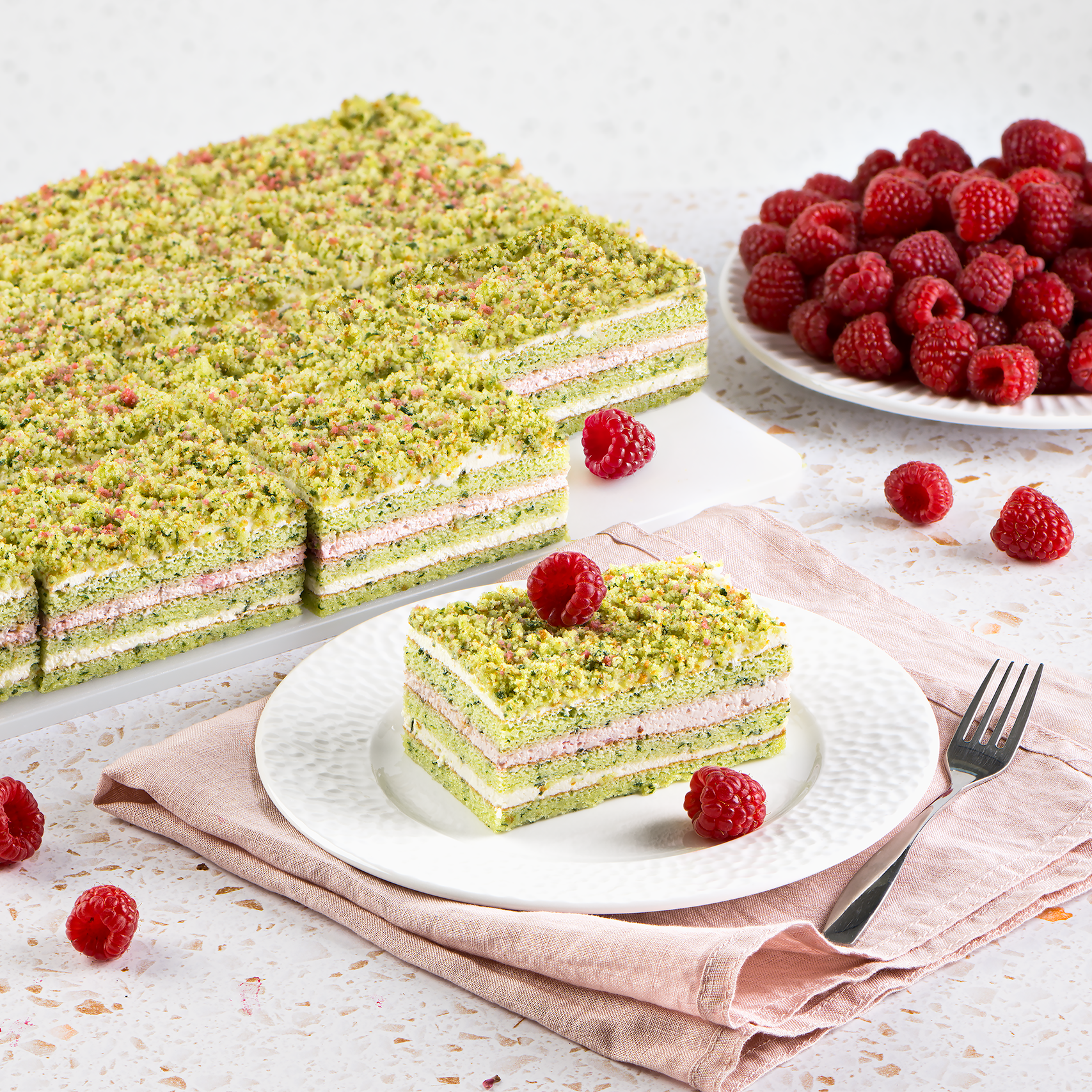 Sour cream together with whipping mix between green spinach sponges. Middle layer is enriched with raspberries. The surface is covered with biscuit crumbs and decorative red orange sprinkles.