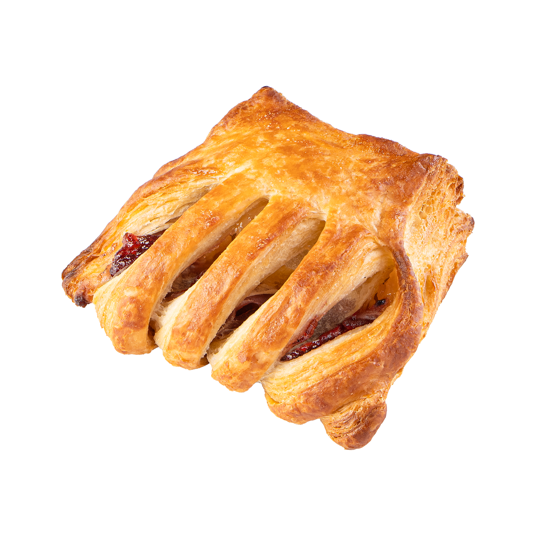 Butter yeast puff pastry with juicy and creamy cranberry and caramel filling. Decorated with cuts on top.